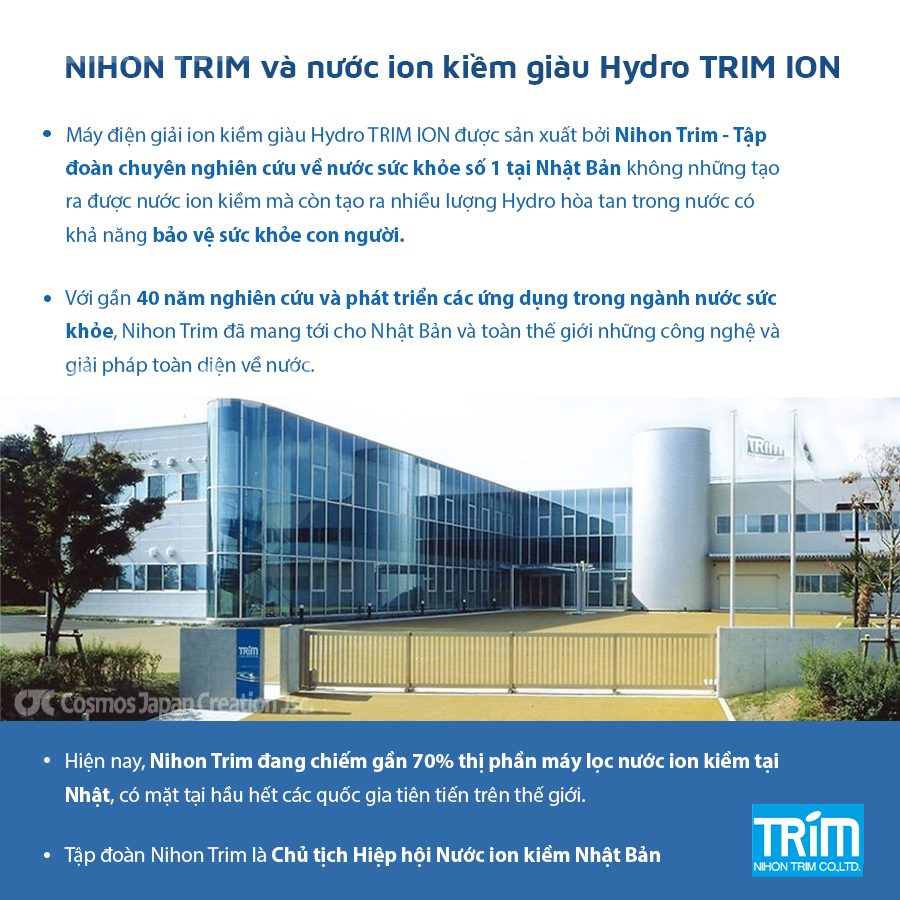 Trim ion Neo được sản xuất bởi Nihon Trim - Tập đoàn chuyên nghiên cứu về nước sức khỏe số 1 tại Nhật Bản. Với gần 40 năm nghiên cứu và phát triển các ứng dụng trong ngành nước sức khỏe, Nihon Trim đã mang tới cho Nhật Bản và toàn thế giới những công nghệ và giải pháp toàn diện về nước. Hiện nay, Nihon Trim đang chiếm gần 65% thị phần máy lọc nước ion kiềm tại Nhật, có mặt tại hầu hết các quốc gia tiên tiến trên thế giới. Tập đoàn Nihon Trim là chủ tịch Hiệp hội Nước ion kiềm Nhật Bản