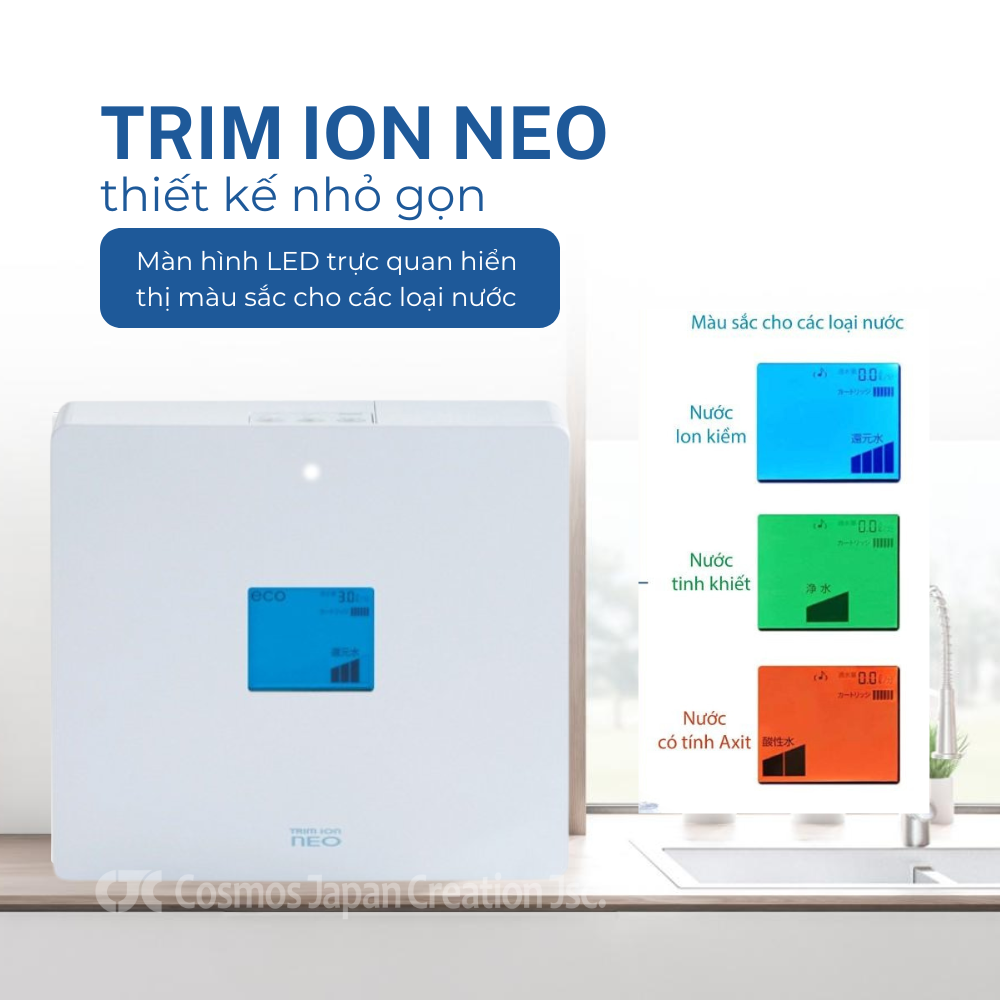 Ngoài ra, Trim ion Neo dễ dàng sử dụng với hiển thị trực quan, thân thiện với mọi lứa tuổi bằng phân biệt màu sắc cho các loại nước, âm thanh thông báo cho người già, thông số hiển thị trên bảng LED và phím bấm cảm ứng.